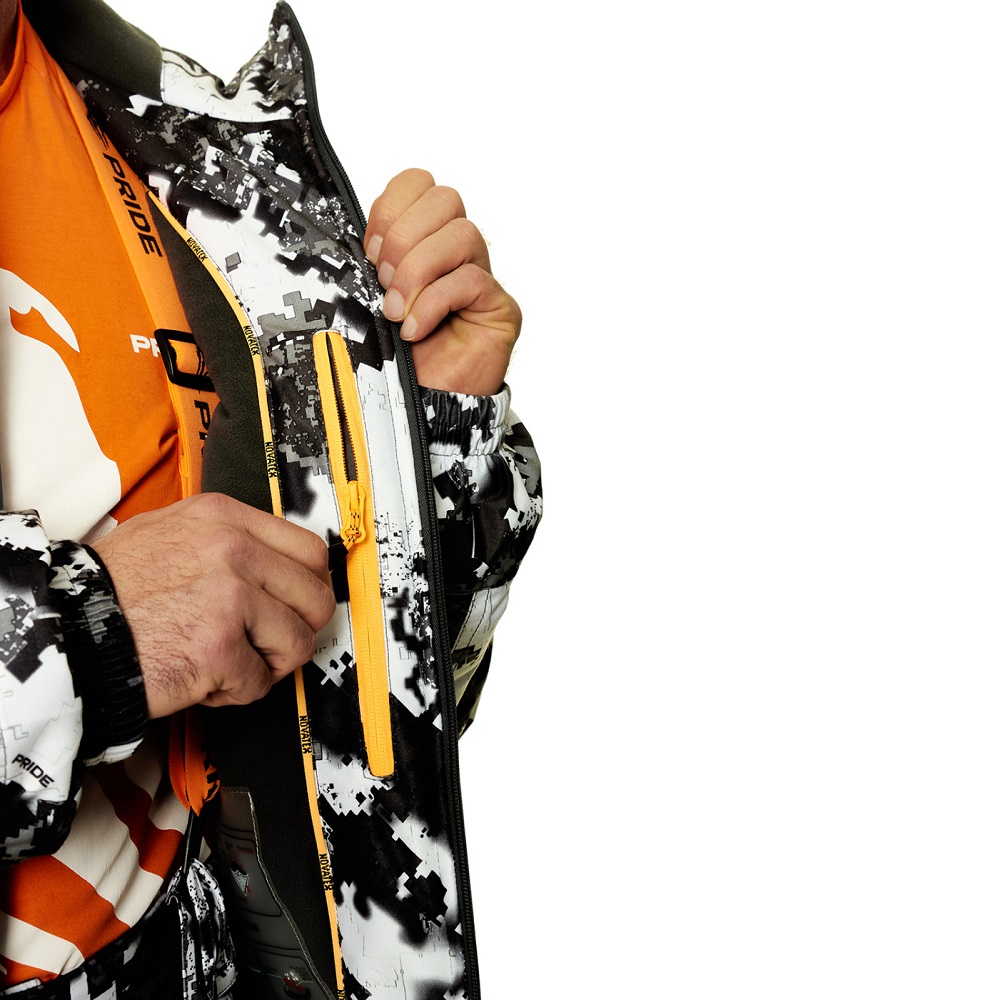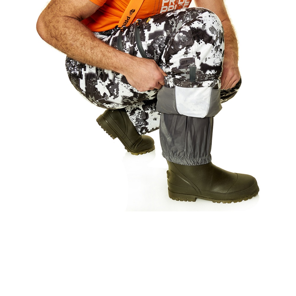 Комфортный температурный режим внутри костюма сохраняется с помощью утеплителя «Русский север», созданного специально для российских климатических условий. Вне сомнения тепло помогает сберегать и нижняя снегозащитная манжета. Для подклада выбраны флис равно как и таффета.