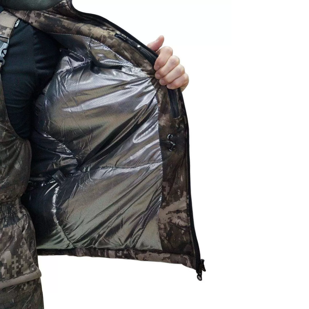 Подкладка костюма из термофольги, а в качестве утеплителя использовался инновационный материал Термотекс. «Лесной» надежно защищает пользователя от холода и отлично выдерживает низкие температуры. Благодаря применению данного утеплителя костюм значительно легче аналогов, и ничуть не уступает им в свойствах.