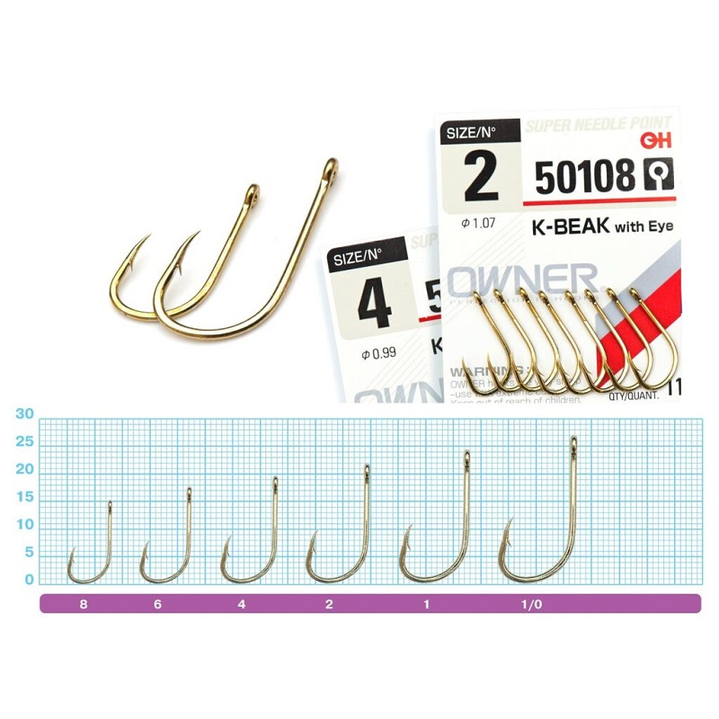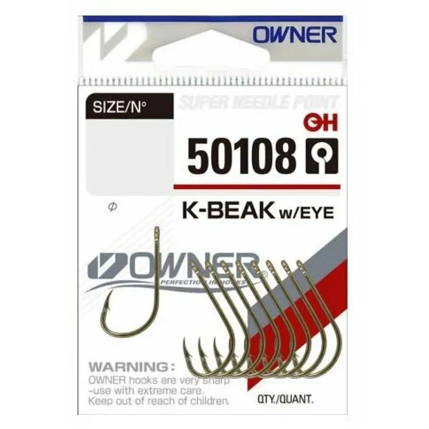 Owner K-Beak with Eye 50108 – серия мощных одинарных крючков, изготовленных из высокоуглеродистой стали. Крючки 50108 имеют круглый загиб, кованый поддев, чуть отогнутое внутрь и в сторону жало, удлиненное цевье с удобным для привязывания колечком и золотистое защитное покрытие. Крючки серии Owner K-Beak with Eye предназначены для ловли сильной мощной рыбы: сазана, налима, карпа, амура, крупного линя. Отлично удерживают объемные насадки такие как, например, мясо ракушки перловицы, червей-выползков и др.