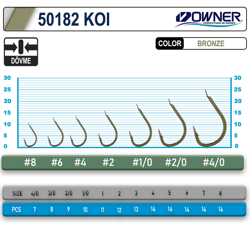 Owner Koi 50182 — серия крючков разработана специально для ловли карпа на донные снасти.Кроме карпа в нашей стране с помощью него активно ловят сазана, крупного карася и линя. Не случайно, что эти крючки способны выдержать очень большие нагрузки, при этом не ломаясь и не деформируясь.