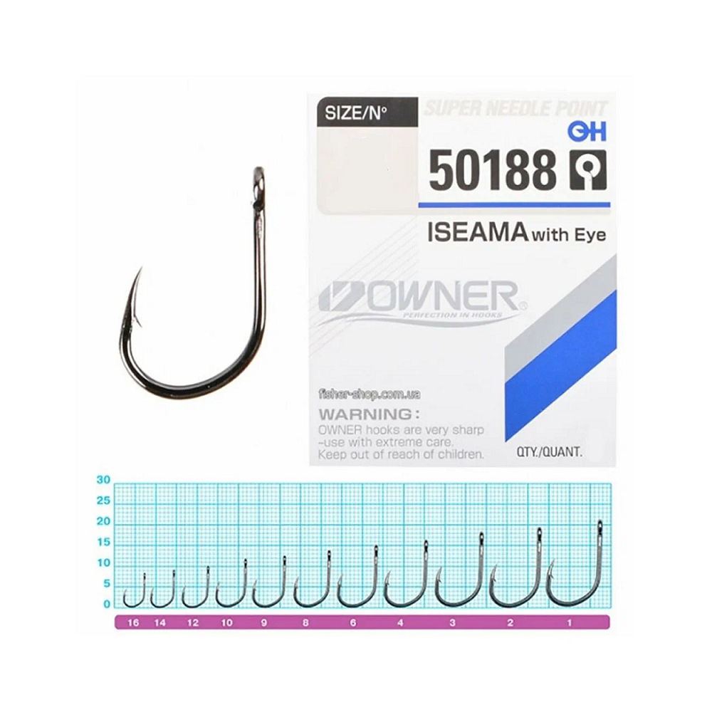Owner 50188 Iseama with eye — универсальные крючки, подходящие для карповых, донных и поплавочных оснасток. Изготовлены из толстой проволоки — очень прочные. Толщина проволоки не позволит крючкам разогнуться даже на крупных экземплярах рыб. Тип монтажа — кольцо на цевье. Проверенная годами форма крючка Owner 50188 не позволяет рыбе освободиться от него. Как говорится, если уж засеклась, то засеклась!