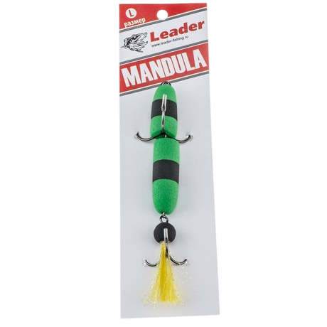 Мандула Leader- джиговая приманка, которой нет равных в определенных условиях. Загадок тут никаких нет. Мандула имеет уникальное поведение в воде. При остановке катушки она не замирает и не ложится на дно, а плавает имитируя кормящеюся рыбку, что привлекает даже самого пассивного хищника. Дополнительным фактором для привлечения хищника является яркое оперение верхнего тройника с люрексом. Данный вид приманок пользуется наибольшей популярностью при ловле судака и крупной щуки.