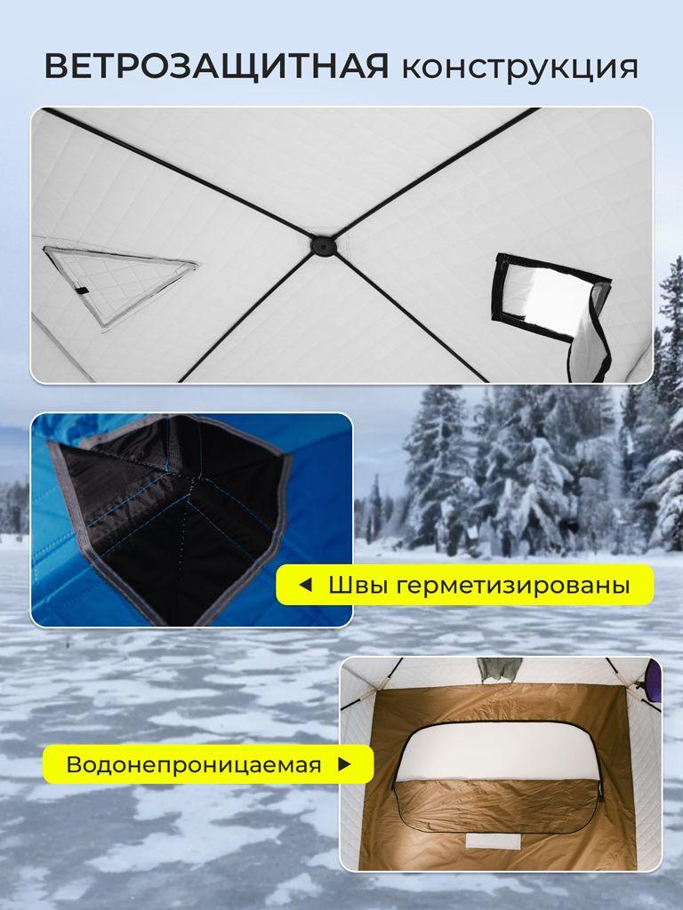Основной материал палатки — оксфорд 210Д, известный своей прочностью и долговечностью. Трехслойная структура палатки гарантирует отличную теплоизоляцию, что делает её идеальной для зимней рыбалки.