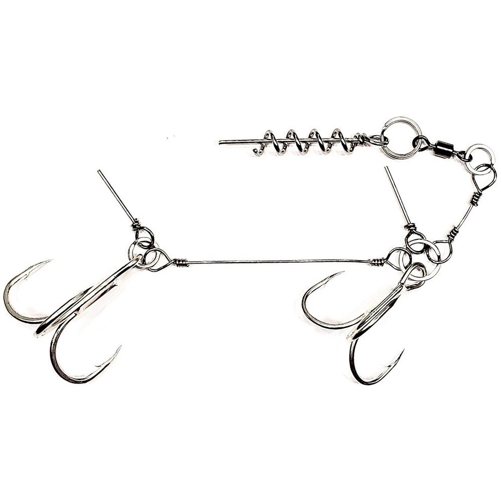 Стингер (Stinger) — готовая оснастка для оснащения крупных силиконовых приманок. Изготовлена из качественной нержавеющей проволоки, джиг-спирали и кованых колец и шипов stinger, а также оснащена двумя тройниками. Оснастки такого типа, со спиралью и шипами, позволяют дольше сохранять силиконовые приманки от щучьих зубов, а так же не нарушают игру.